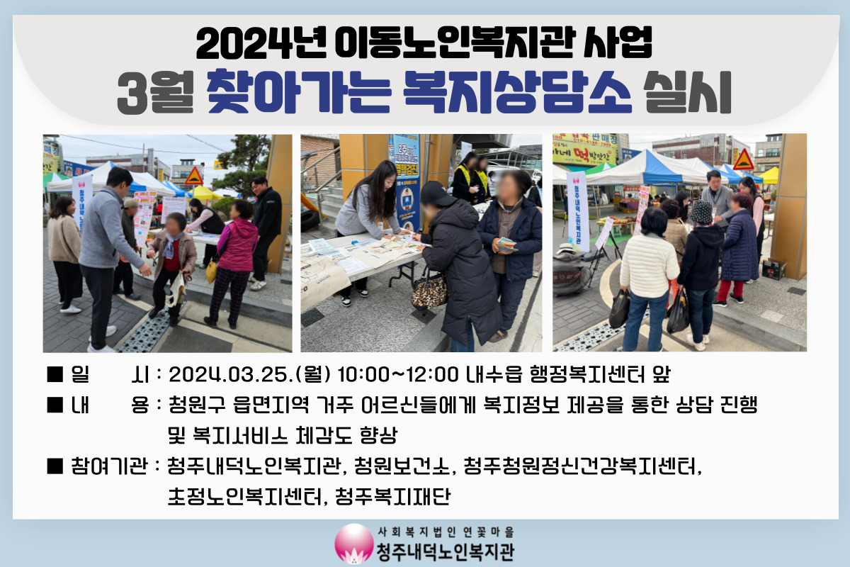 청주내덕노인복지관에서는 3/25(월) 내수 5일장이 열리는 내수읍 행정복지센터 앞에서 이동노인복지관 사업 '3월 찾아가는 복지상담소 프로그램'을 진행하였습니다. 이 날, 찾아가는 복지상담소 프로그램을 통해 청주내덕노인복지관에서 운영하고 있는 위기 및 취약가구 어르신들을 위한 여러 사업에 대해 안내드렸습니다. 또한 청주내덕노인복지관 외에도 다양한 복지·의료기관이 함께 참여하여 어르신들에게 다양한 복지정보와 의료 서비스를 제공하는 시간을 가졌습니다. 앞으로도 청원구 농촌지역 곳곳에 "찾아가는 이동노인복지관"으로 어르신들을 더 많이 찾아뵐 수 있도록 하겠습니다~!