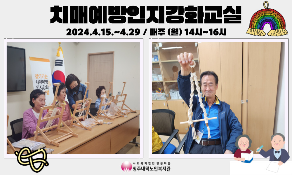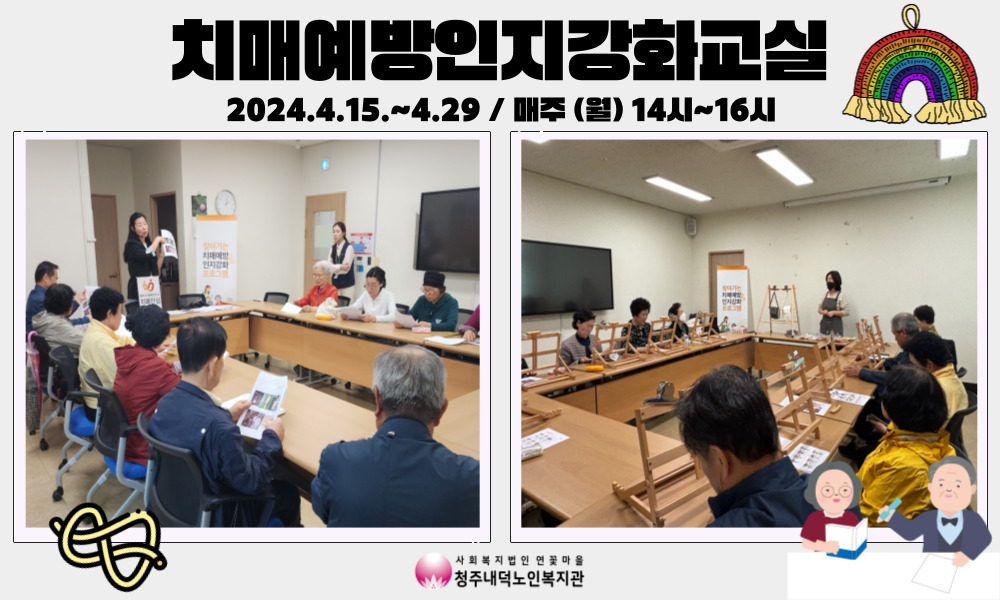 청주내덕노인복지관에서는 매주 월요일 오후 2시부터 4시까지 청원보건소 치매안심센터와 함께 치매예방인지강화교실 프로그램이 진행중입니다.