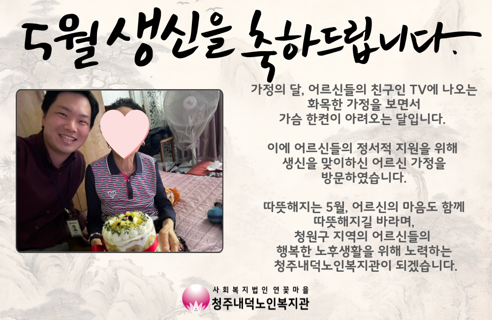 따뜻해지는 5월, 어르신의 마음도 함께 따뜻해지길 바라며, 청원구 지역의 어르신들의 행복한 노후생활을 위해 노력하는 청주내덕노인복지관이 되겠습니다.