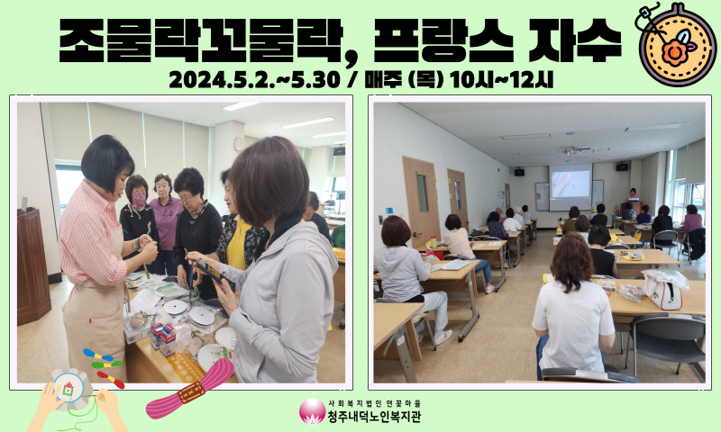 청주내덕노인복지관에서는 매주 목요일 10시부터 12시까지 평생학습우수프로그램지원사업인 조물락꼬물락, 프랑스자수 프로그램이 있는 날입니다