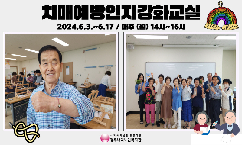 청주내덕노인복지관에서는 4월15일부터 6월17일까지 매주 월요일 오후 2시부터 4시, 청원보건소 치매안심센터와 함께 치매예방인지강화교실 프로그램을 달려왔습니다.