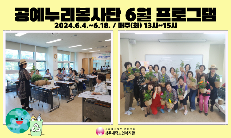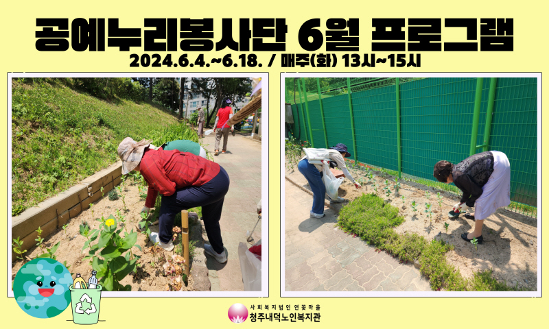 청주내덕노인복지관에서 진행하는 2024년 노인자율봉사활동사업 공예누리봉사단이 6월 원예교육과 함께 다양한 꽃을 복지관 주변에 심거나 잡초를 정리하는 등 원예봉사활동을 진행하였습니다. 공기정화 및 오염물질을 흡수해 환경에 도움이 되는 식물에 대해 이해해볼 수 있었으며, 복지관 주변 화단을 다양한 종류의 꽃과 모종으로 가득 채우고 더운 날씨에도 잡초를 정리하며 더 화사하고 환경을 가꿀 수 있는 기회를 가졌습니다.