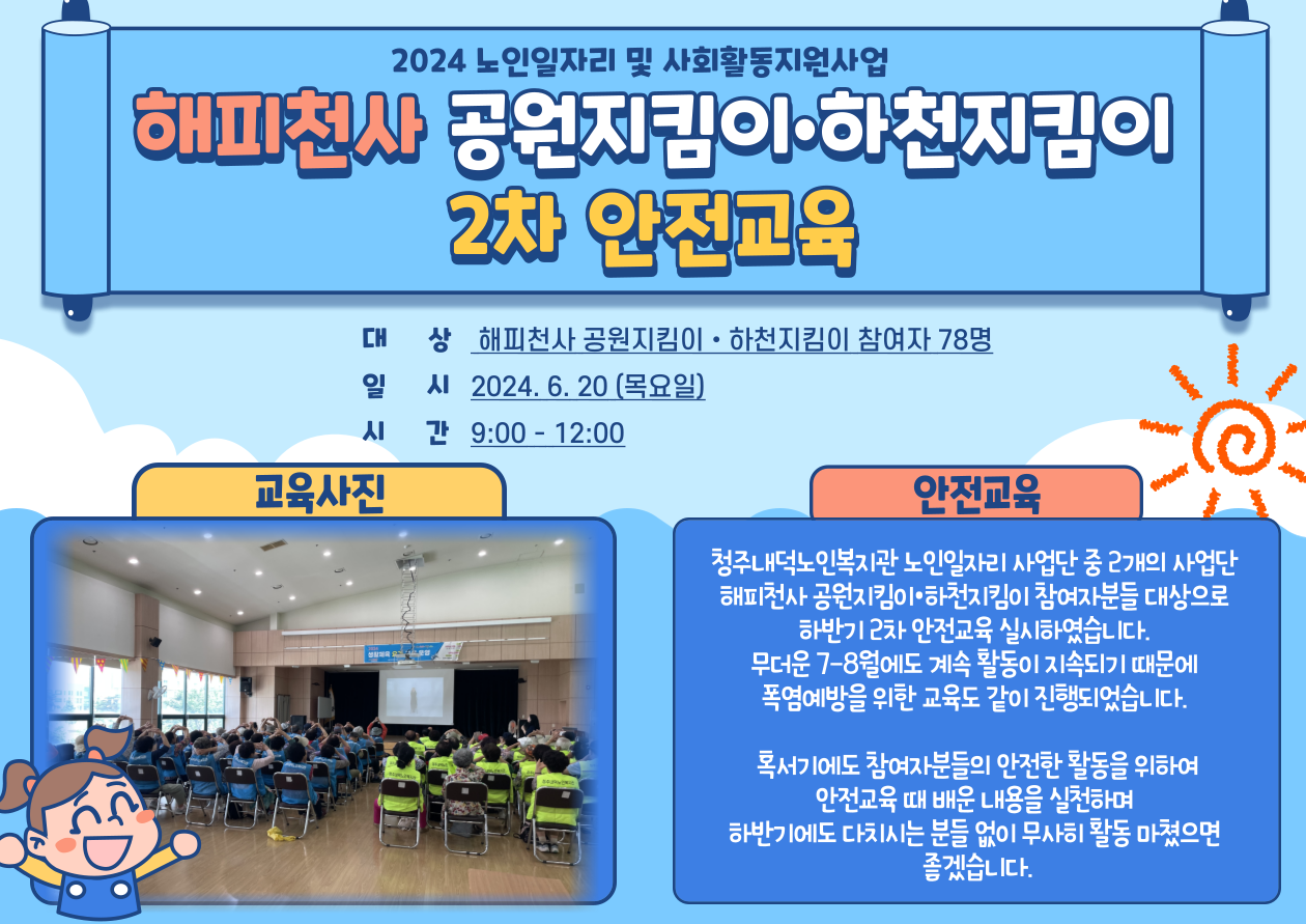 청주내덕노인복지관에서 2024년 6월 20일(목) 9:00-12:00 해피천사 공원지킴이•하천지킴이 2차 안전교육이 실시되었습니다 ~! 교육시작 전 체조하시는 어르신들의 모습입니다. ㅎㅎ 하반기(7-11월) 남은 활동을 위해 공원지킴이, 하천지킴이 참여자 78분이 모여 교육이 진행되었는데요, 7-8월에는 무더운 날씨로 인해 참여자들의 건강과 활동이 걱정되어 혹서기 예방 교육도 함께 진행하였습니다. 안전교육을 통해 배운 내용을 바탕으로 남은 하반기동안 다치시는 분 없이 건강하게 일자리 활동이 마무리 되었으면 좋겠습니다.