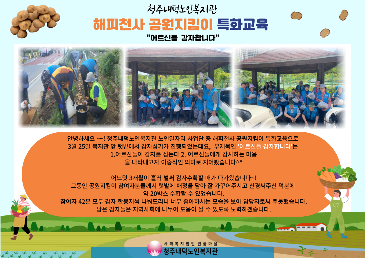해피천사 공원지킴이 참여자분들과 함께 6/28일에 감자수확을 완료하여 참여자 42분에게 모두 나눠드렸습니다^^ 많은 양은 아니지만 참여자분들 모두 한봉지씩 드릴 수 있어 기뻤고 감자를 받고 좋아하시는 모습을 보니 더 기뻤습니다! 그동안 텃밭을 잘 가꿔주신 해피천사 공원지킴이 참여자분들께 감사드립니다. 앞으로도 참여자분들에게 유익한 교육을 진행할 수 있도록 노력하겠습니다! 문의- 청주내덕노인복지관 043-216-9810 |
