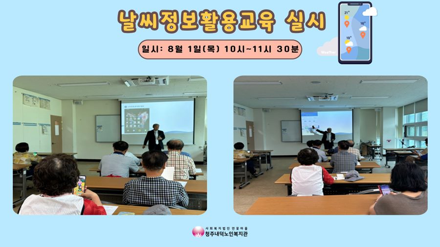 이번 교육은 기상청 기상기후인재개발원의 지원으로 전문 강사님이 오셔서 기상청 날씨알리미앱 소개와 이상기후의 원인과 대처방안에 대해 강의해주셨습니다! 그리고 기상과 기후의 차이를 사람에 빗대어 설명해주셨습니다. 기상은 지구의 기분 같이 짧은 날씨들을 설명하는 단어이고, 기후는 지구의 성격처럼 잘 변하지 않는 날씨를 설명하는 단어라고 하여 참여자분들도 쉽게 이해하실 수 있었습니다. 그 다음 최근 이상기후가 발생하고 있다는 뉴스 영상을 소개하여 이상기후의 심각성에 대해서 설명해주시면서 후대에 자녀들이 살아갈 세상을 위해 나 먼저 작은 실천이라도 하는 것이 중요하다고 강조해주시면서 교육을 마무리하였습니다. 참여자분들은 기상과 기후가 같은 건줄만 알았는데 처음 뜻을 알게되었다, 요즘 날씨가 이상한건 느껴졌는데 얼마나 심각한지에 대해 자세히 알게되었다 등 유익한 교육이었다고 소감을 말씀하셨습니다. 다음에도 이용자분들께 다양한 분야의 교육 기회를 제공할 수 있도록 노력하겠습니다!