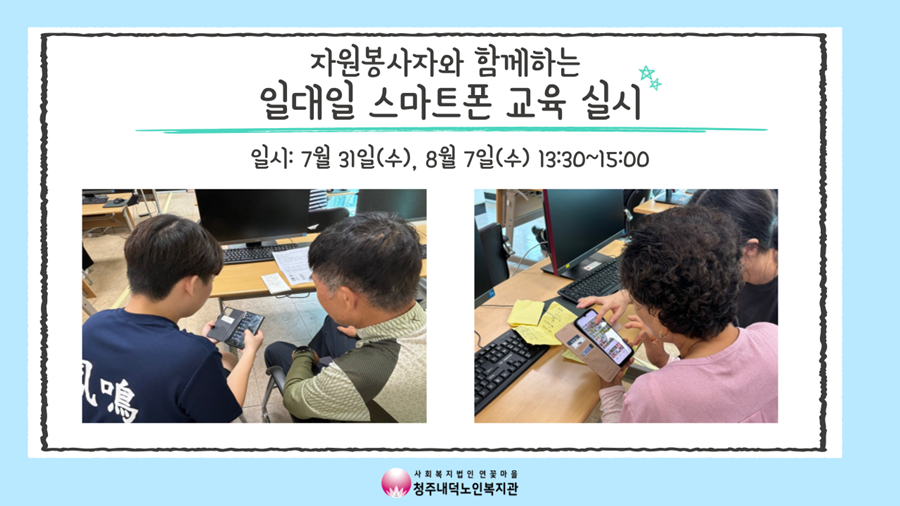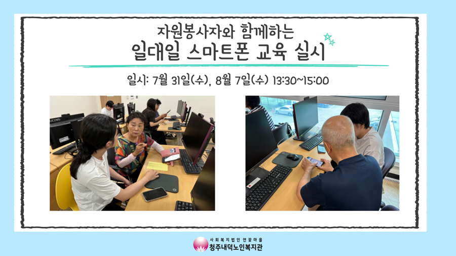 7월 31일(수), 8월 7일(수) 복지관 2층 컴퓨터실에서 자원봉사자와 함께하는 일대일 스마트폰 교육이 진행되었습니다. 이번에는 봉명고등학교 학생 6명이 여름 방학 기간에 방문하여 봉사활동으로 교육을 진행해주었습니다. 봉사자 1명, 참여자 1명 일대일로 짝궁을 맺어서 평소 스마트폰을 사용하면서 궁금했던 점에 대해 묻고 알려주는 시간을 가졌습니다! 사진 및 영상 편집, 지도 어플 사용법, 검색하는 법 등 참여자분들 마다 서로 다른 궁금증들을 물어보셨고, 자원봉사자분들은 종이에 순서를 메모 해주시는 등 열심히 답변해주셨습니다. 참여자분들은 이런 방식의 교육이 자주 있었으면 좋겠다, 스마트폰의 전반에 적극적으로 지도해주셔서 도움이 많이 되었다고 만족해하셨습니다. 여름방학에 시간을 내어 스마트폰 교육 봉사를 진행해준 봉명고등학교 학생들께 한 번 더 감사드리며 앞으로도 이용자분들이 스마트기기에 대한 교육을 받으실 수 있도록 노력하겠습니다!