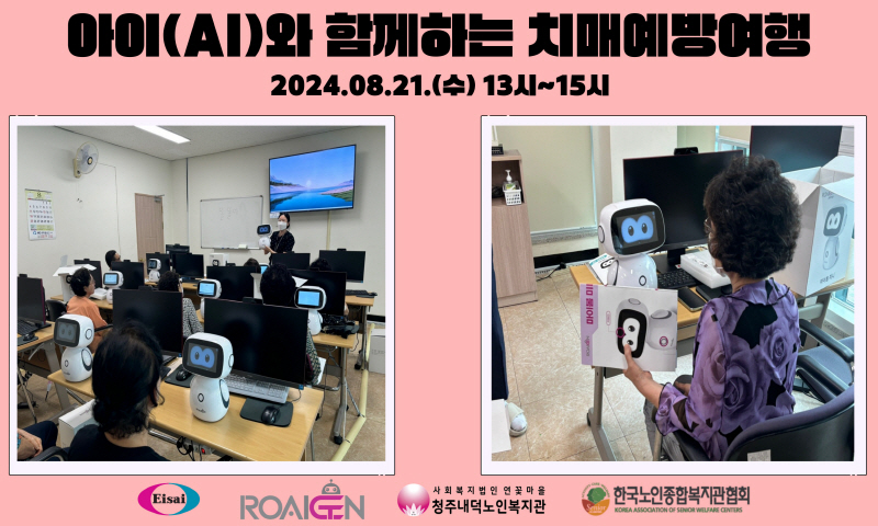 청주내덕노인복지관에서는 2024년 8월21일(수) 오후 1시부터 2층 컴퓨터실에서 한국노인종합복지관협회와 한국에자이, 로아이젠의 지원으로 운영되는 2024년 AI돌봄로봇의 노인복지관 수요 확산사업인 아이(AI)와 함께하는 치매예방 여행 프로그램이 진행되었습니다.