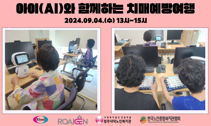 청주내덕노인복지관에서는 매주 수요일 오후 1시~3시까지 한국노인종합복지관협회와 한국에자이, 로아이젠의 지원으로 AI돌봄로봇의 노인복지관 수요 확산사업인 아이(AI)와 함께하는 치매예방 여행 프로그램이 진행됩니다.
