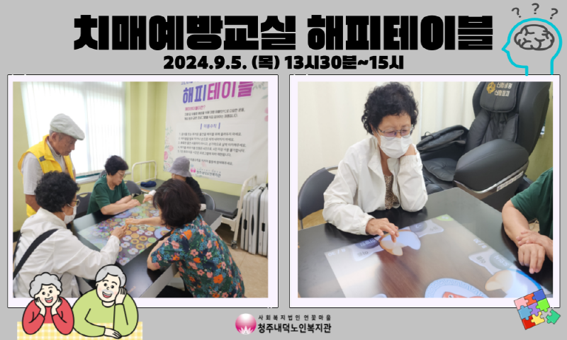청주내덕노인복지관에서는 9월5일부터 매주 목요일 오후 1시30분에 치매예방교실 해피테이블이 진행됩니다.
