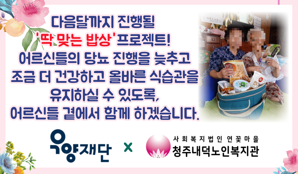 내수읍에 거주하시는 한 어르신께서는 매달 지원해드리는 당뇨식재료가 혈당 관리에 정말 큰 도움이 된다며, 어르신과 이웃 주민분들까지 함께 입을 모아 우양재단과 청주내덕노인복지관에 거듭 감사인사를 전하셨습니다.