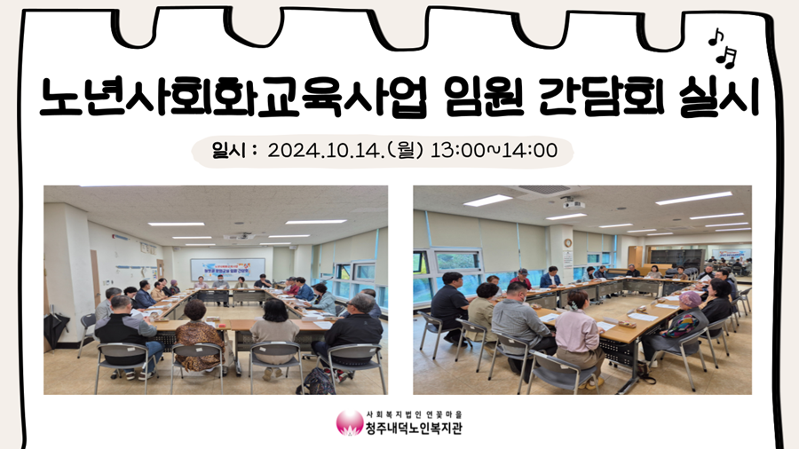 10월 14일(월) 13시에 복지관 2층 으뜸방에서 2024년 늘벗골 문화교실 임원 간담회가 진행되었습니다! 이번 간담회에서는 늘벗골 문화교실 공지사항 안내 및 임원분들이 강좌를 수강하시면서 복지관에 대한 건의사항에 대해서 얘기를 나누었습니다. 2023년도에 진행했던 임원 간담회에서 나온 안건들과 진행 사항도 안내되었습니다. 임원분들은 그간 느끼셨던 부분에 대해 여러 의견을 말씀해주셨고, 또 임원분들간에 서로 공감하기도 하고 의견을 공유하여 적극적으로 간담회 자리가 될 수 있었습니다. 시간을 내어 참여해주신 임원분들께 감사드리며, 앞으로도 이용자분들이 더 좋은 환경에서 프로그램을 들으실 수 있도록 노력하겠습니다!