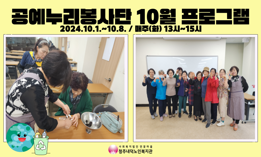 청주내덕노인복지관에서 진행하는 2024년 노인자율봉사활동 공예누리봉사단이 10월 새적굴공원 내 숲해설 체험과 더불어 동네환경지킴이(플로깅) 활동과 그린역량강화교육을 진행하였습니다.
