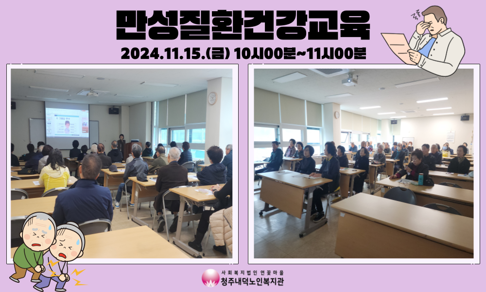2024년 11월8일(금) 10시~11시 청주내덕노인복지관 2층 배움방에서 충청북도청주의료원 공공보건의료협력팀과 연계하여 만성질환관리 건강교육이 진행되었습니다.