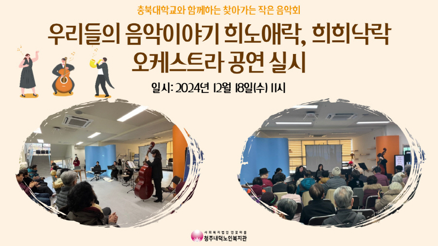 12월 18일 수요일 오전 11시 복지관 1층 로비 건강마당 부근에서 충북대학교와 함께하는 '우리들의 음악이야기, 희노애락, 희희낙락' 오케스트라 공연이 실시되었습니다. 이번 공연은 충북대학교 생활과학대학의 지원으로 진행되었으며, 오케스트라 공연팀인 오션뮤직앙상블에서 6명의 공연팀이 오셔서 오케스트라 공연을 선보여주셨습니다. 악기와 연주자 소개로 공연을 시작하였으며, 중간중간에 곡 맞추기, 악기 이름 기억해보기 등 퀴즈도 진행하고, 아는 노래를 다같이 따라 부르기도 진행하여 이용자분들이 집중하면서 즐겁게 참여하실 수 있었습니다. 연주곡들도 이용자분들이 잘 아는 동요와 트로트를 시작으로 드라마, 클래식, 캐롤음악까지! 다양한 곡을 연주하여 이용자분들의 연말을 따뜻하게 만들어주셨습니다. 또한, 공연이 로비에서 진행되어 지나가시던 이용자분들도 감상을 할 수 있으셨습니다. 연말을 따뜻하게 만들어준 공연팀께 감사드리며, 앞으로도 이용자분들이 다양한 문화예술을 경험해보실 수 있도록 노력하겠습니다!