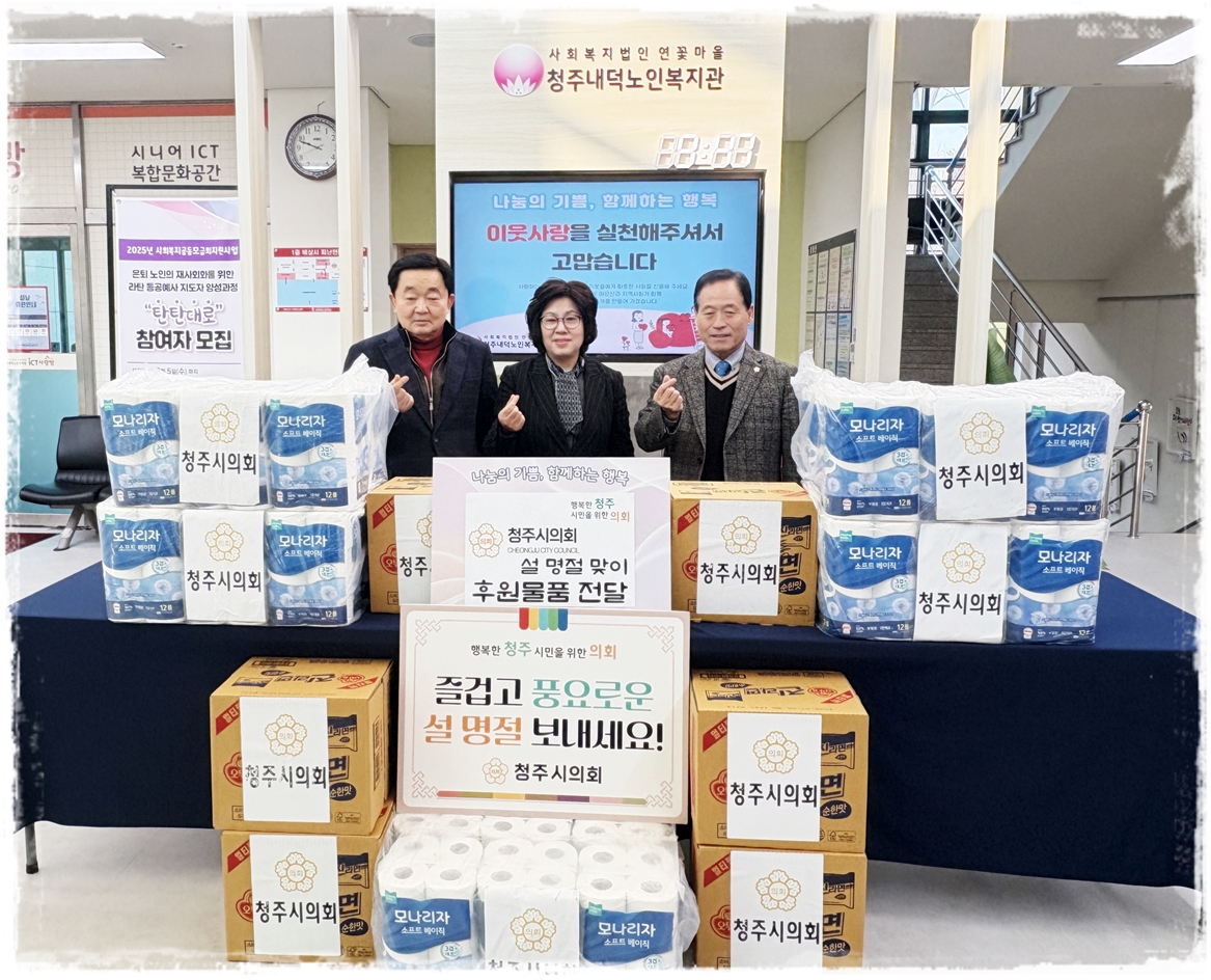 2025/1/23(목) 청주시의회에서는 설 명절을 맞아 청주내덕노인복지관에 화장지, 라면 등 후원물품을 전달해주셨습니다 전달식에는 정태훈, 임정수 청주시의회 의원이 참석하여 전달해주셨습니다 정태훈, 임정수 의원은 "설 명절을 맞아 작은 보탬이지만 우리 지역 이웃들에게 따뜻한 마음을 전할 수 있어 기쁘다"며 "의정활동을 통해 소외받는 이웃이 없도록 소외계층과 복지사각지대 해소를 위해 최선을 다하겠다"고 전했습니다.