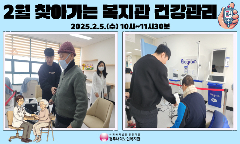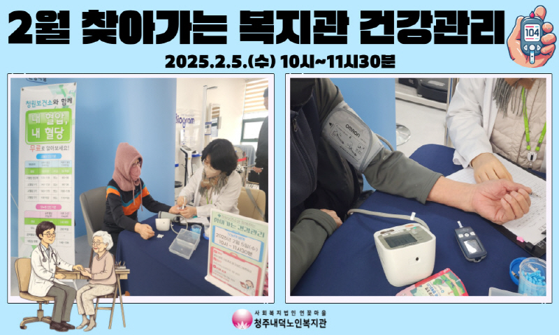 청주내덕노인복지관에서는 매월 첫번째 수요일 10시부터 11시30분까지 찾아가는 복지관 건강관리가 진행되니 앞으로 많은 관심과 참여 부탁드리겠습니다.