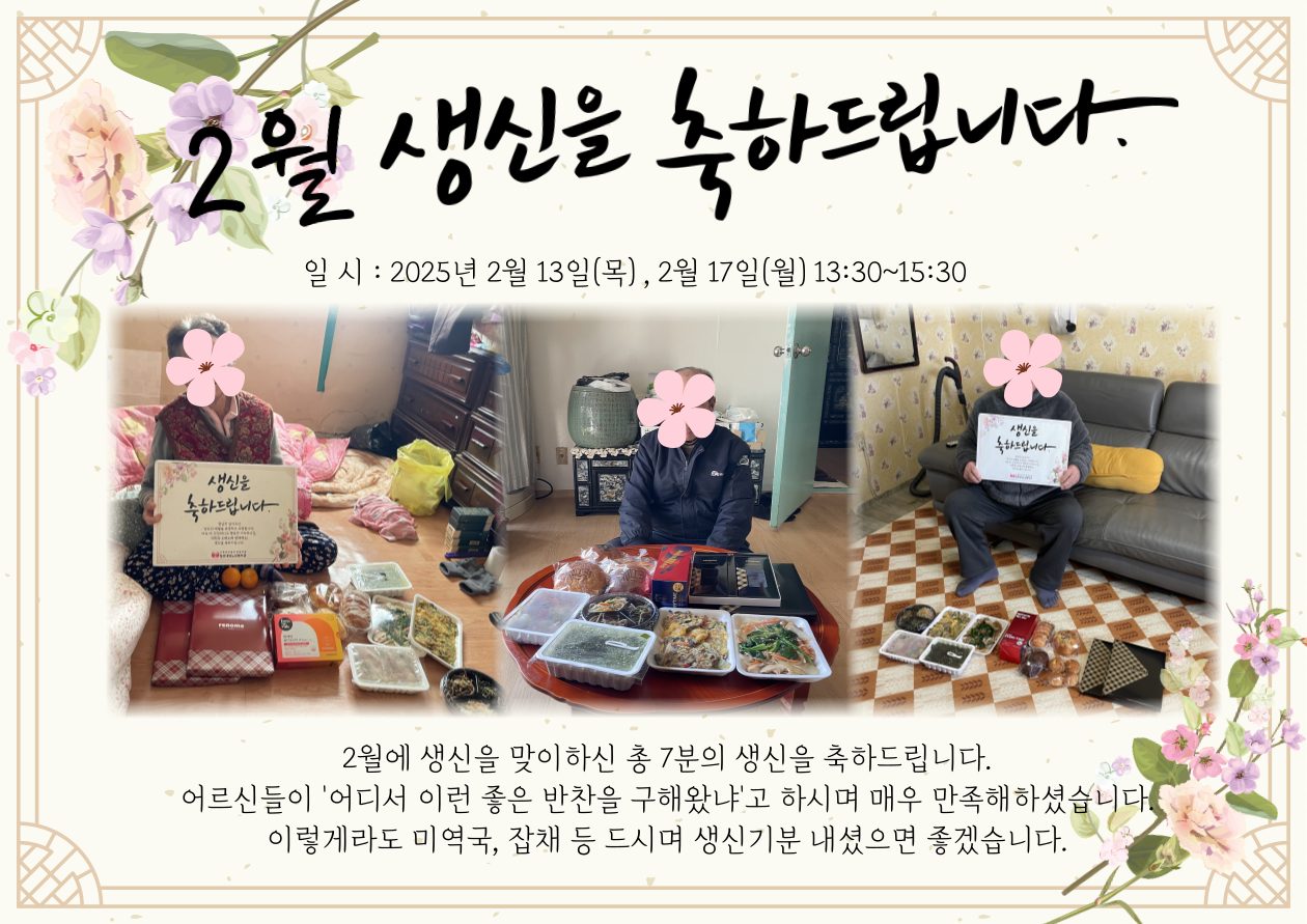 2025년 2월에 생신을 맞이하신 정서 지원 대상자는 총 7분으로 7분 지원 실시하였습니다. 생신상 반찬과 생신선물 양말, 후원물품(빵) 지원하였습니다. 어르신들께서 '어디서 이런 좋은 반찬을 구해왔냐, 너무 맛있겠다. 고맙다' 고 말씀전해주셨습니다.