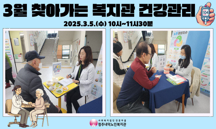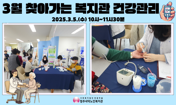 청주내덕노인복지관에서는 매월 첫번째 수요일 10시부터 11시30분까지 청웝보건소와 함께 찾아가는 복지관 건강관리가 진행되니 앞으로도 많은 관심과 참여바랍니다