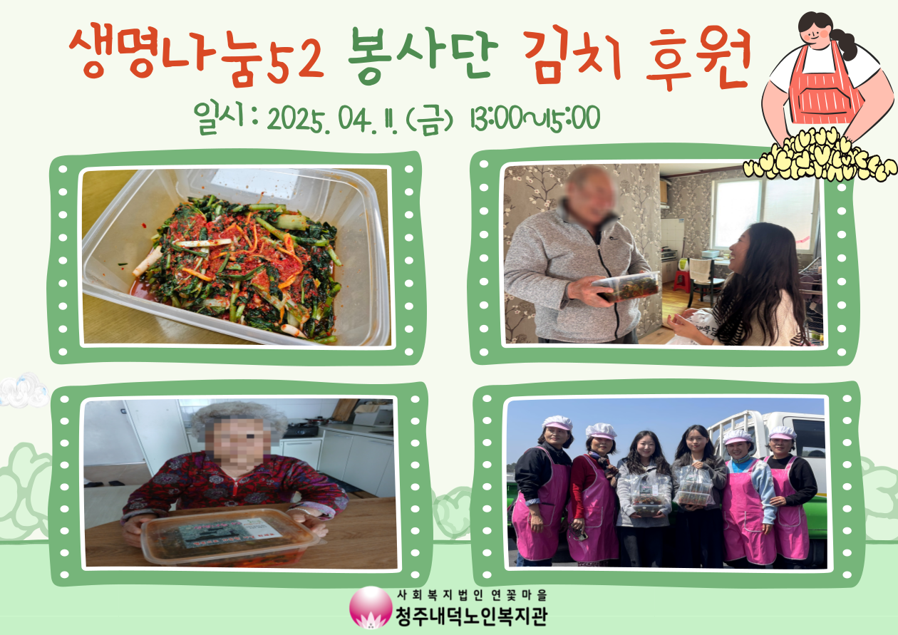 어르신들의 밥상에 빠지지 않고 올라가는 김치! 김치를 후원해주신 생명나눔 52 봉사단에 감사드리며, 청주내덕노인복지관은 지역 내 저소득 재가어르신들을 위해 다양한 지역 자원을 연계할 수 있도록 노력하겠습니다!