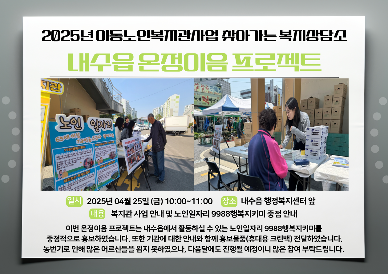 2025년 이동노인복지관사업 찾아가는 복지상담소는 매월 1회 장날에 맞춰 내수읍 행정복지센터 앞에서 진행되는데요, 이번 4월에는 25일 10:00~11:00에 진행되었습니다.