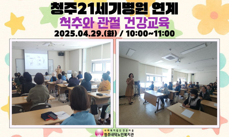 2025년 4월 29일(화) 10시~11시 청주내덕노인복지관 2층 배움방에서 청주21세기병원과 함께하는 척주와 관절 건강교육을 진행하였습니다.