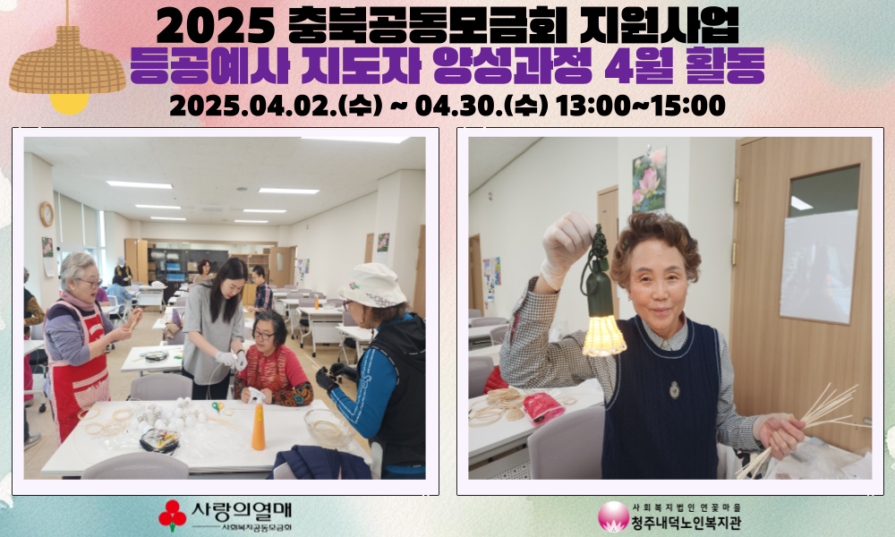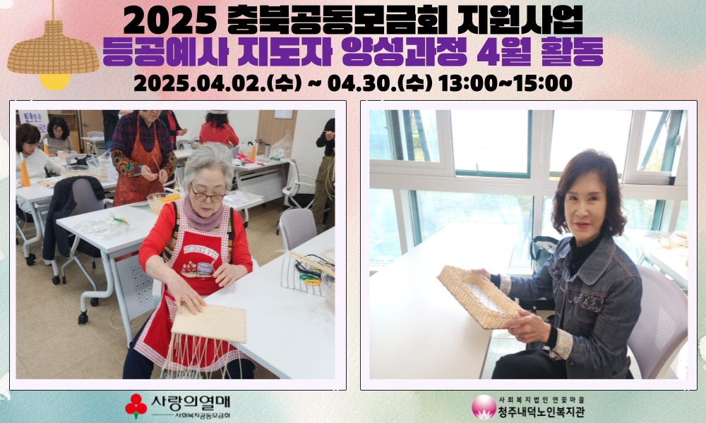 2025년 4월 2일부터 30일까지, 매주 수요일 오후 1시~3시까지 청주내덕노인복지관 2층 으뜸방에서 공동모금회지원사업인 탄탄대로! 라탄 등공예사 지도자 양성과정 교육이 진행되었습니다.