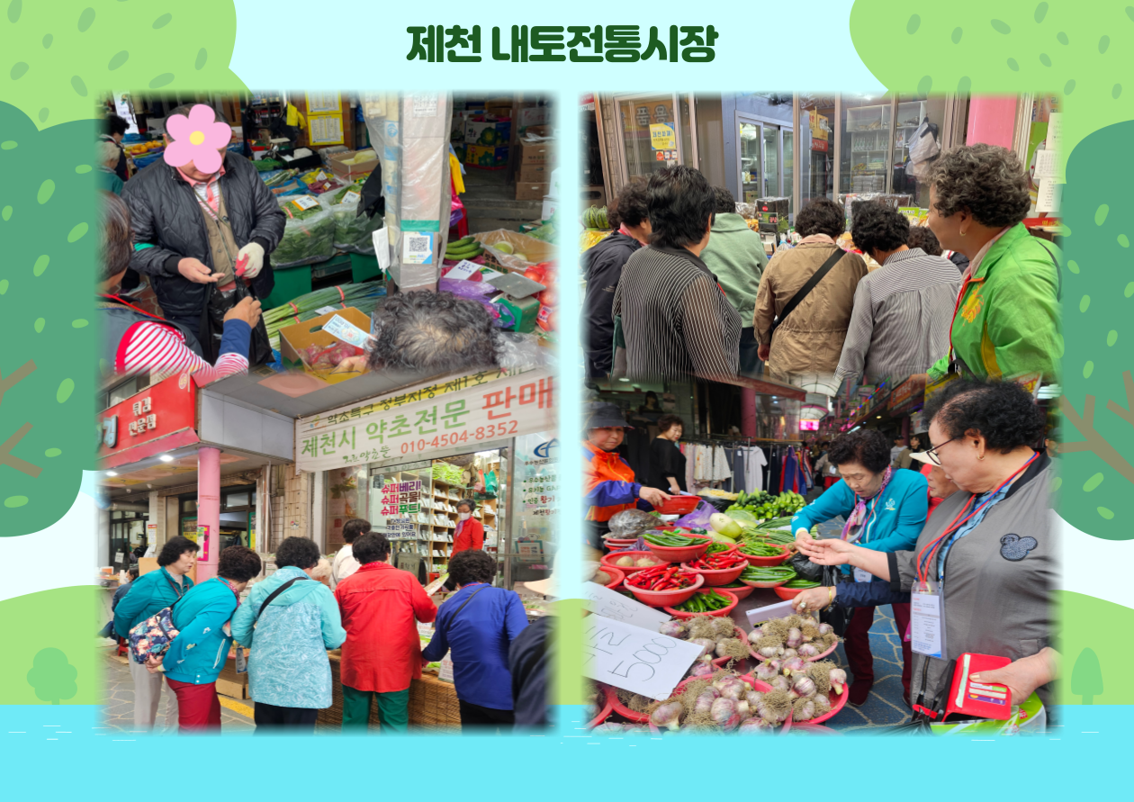 제천시 전통시장 러브투어 사업으로 지역관광을 겸하여 전통시장 장보기를 할 수 있도록 지역화폐(35만원)와 전통시장 관광해설사분을 지원해주셨습니다. 버스에서 관광해설사분의 해설을 들으며, 내토전통시장에 들러 전통시장 활성화를 위해 어르신들 각각 물건을 구입하였습니다. 가장 장을 많이 본 어르신들께는 소정의 선물도 지급되었답니다 ^^