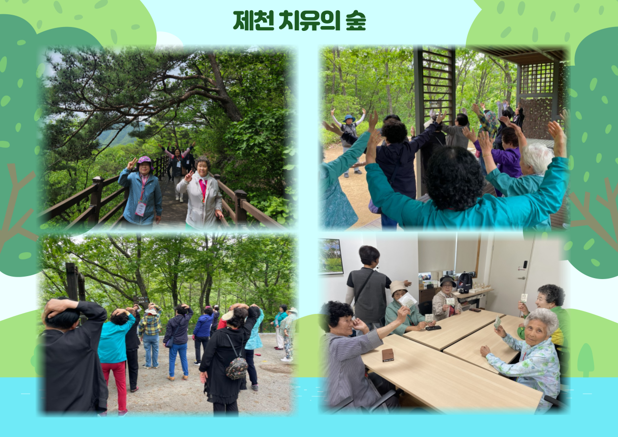 제천 치유의 숲에서 피톤치드를 마시며 인생샷도 남기고, 어르신들과 함께 자연을 만끽했습니다. 2교시 3교시는 실내 프로그램으로 진행되었는데요,