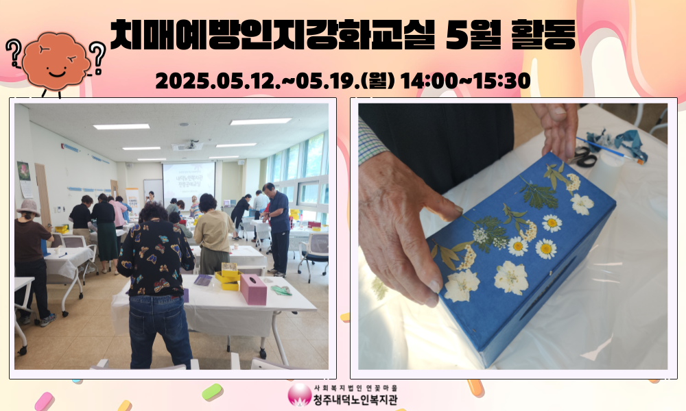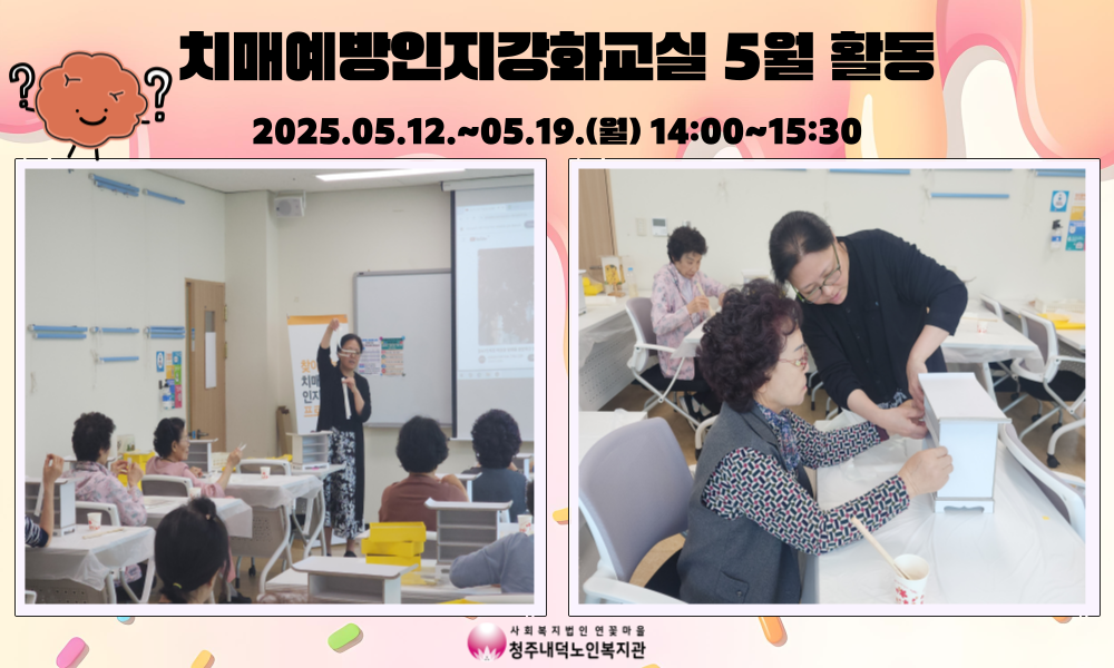 2025년 치매예방인지강화교실 5월 프로그램 진행 청주내덕노인복지관에서는 청원보건소 치매안심센터와 함께 매주 월요일 오후 2시부터 3시30분까지 치매예방인지강화교실 프로그램이 진행되었습니다.