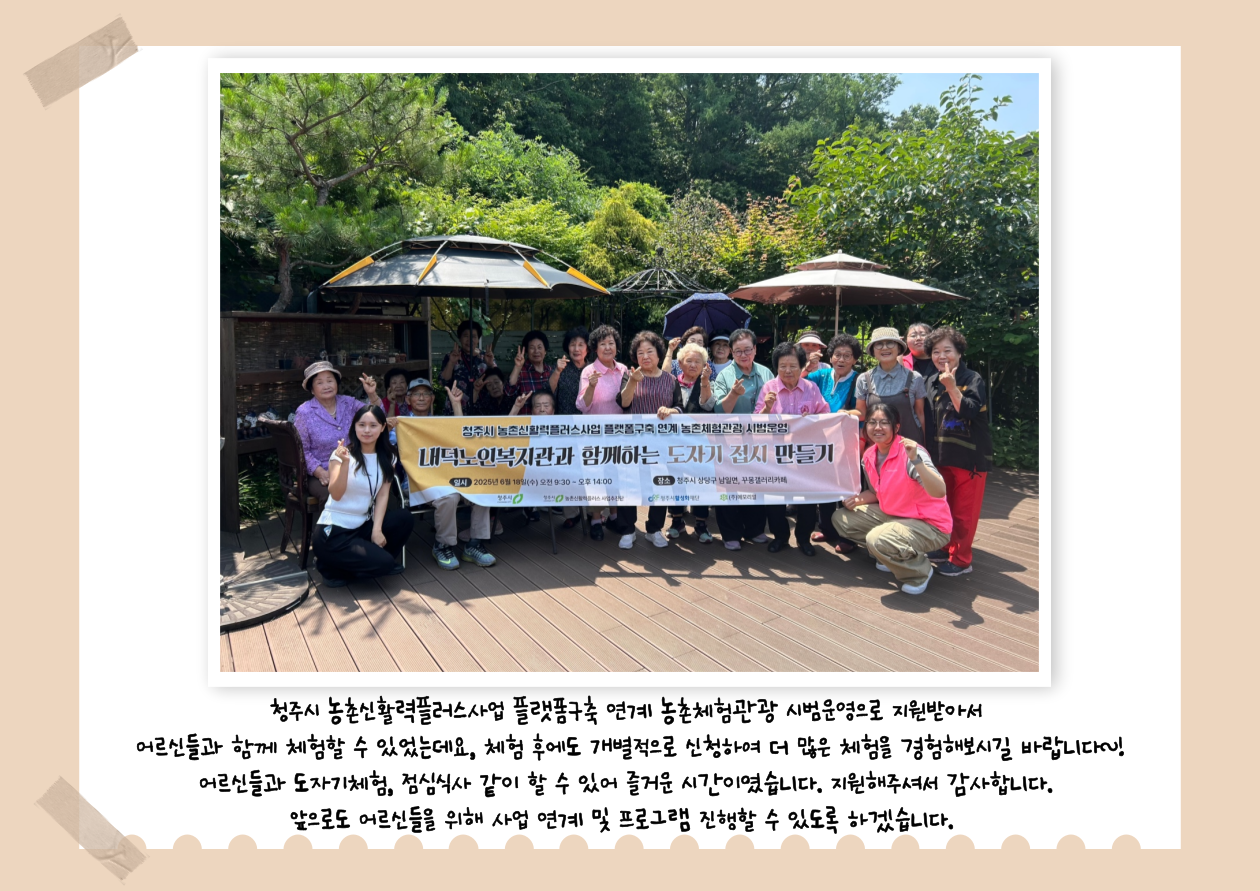 2025년 6월 18일 수요일 09:00~14:00까지 은곡4리 경로당 어르신들 18명과 함께 농촌체험관광 진행하였습니다. 이번 체험은 남일면에 위치한 "꾸몽 갤러리"에서 도자기 접시 만들기 체험 진행하였으며, 점심식사도 같이 하였습니다. 청주시 농촌신활력플러스사업 농촌체험관광 시범운영으로 지원받아 어르신들과 함께 즐거운 시간을 가졌습니다. 지원해주셔서 감사하고, 저 또한 하반기에도 많은 체험을 진행할 수 있도록 노력하겠습니다~ 문의) 윤민애 사회복지사 043-216-9810
