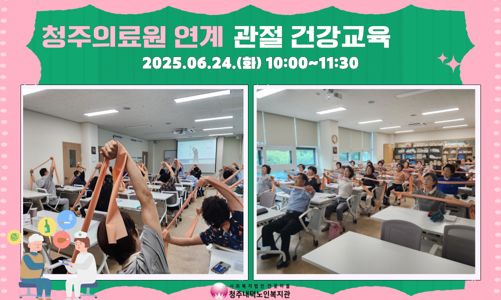 2025년 6월 24일 화요일, 오전 10시부터 11시까지 청주내덕노인복지관 2층 으뜸방에서 청주의료원과 함께 관절건강교육을 진행하였습니다. 충청북도청주의료원 공공보건의료협력팀과 연계하여 진행된 관절건강교육은 관절과 관절염에 대한 이해 뿐 아니라 집에서도 간단하게 할 수 있는 관절 운동도 배워볼 수 있었습니다.
