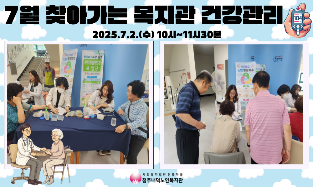 7월 청원보건소와 함께 진행한 찾아가는 복지관 건강관리는 혈압 및 혈당 검사와 영양상담이 함께 진행되었습니다. 날이 많이 더움에도 불구하고 많은 이용자들이 찾아주어 건강관리 상담을 받을 수 있었습니다. 매월 찾아가는 복지관 건강관리가 8월 한 달은 쉬어가고 9월에 다시 찾아올 예정입니다. 모두 건강관리 잘하시고, 9월 찾아가는 복지관 건강관리로 다시 뵙겠습니다.