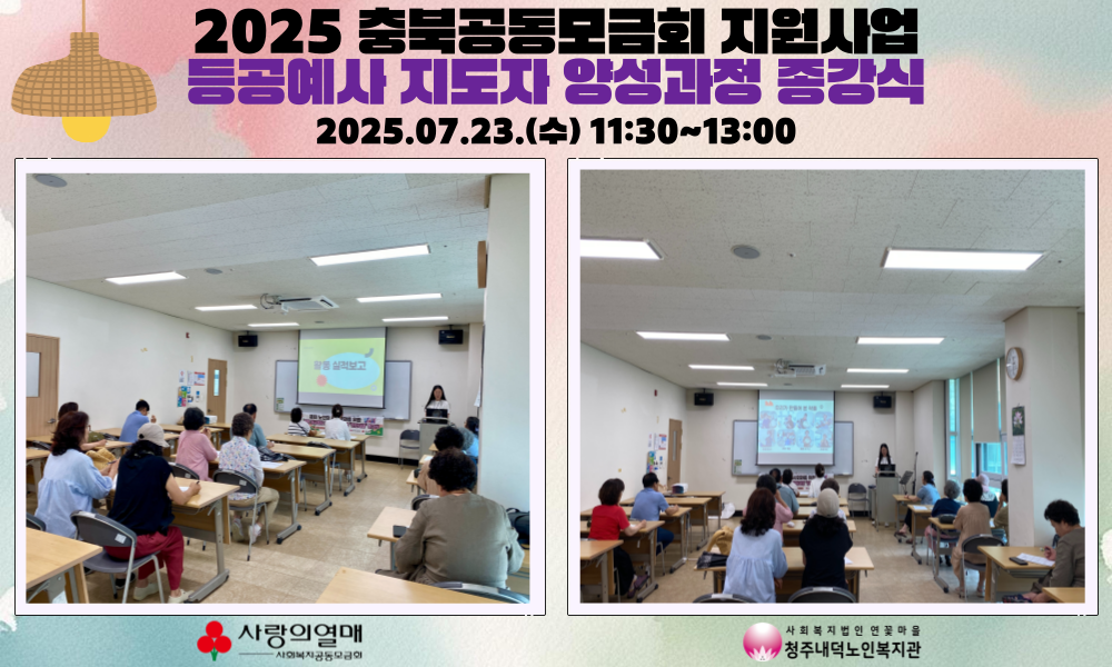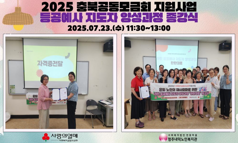 2025년 7월 23일(수) 오전11시30분 공동모금회지원사업인 탄탄대로, 라탄등공예사 지도자 양성과정 종강식이 진행되었습니다. 양성과정에서는 총 20명의 참여자가 신청하여 전원 출석과정을 이수 후 지도자 자격시험까지 모두 통과하여 라탄 등공예사 2급 자격증을 100% 취득할 수 있었습니다. 종강식을 통해 교육 과정을 되돌아보는 시간과 서로를 격려하고 성과를 공유하는 시간을 가졌습니다. 다음주 한 주는 쉬어가고 8월6일(수) 부터는 사랑의 손길 프로젝트가 본격적으로 시작됩니다. 사랑의 손길 프로젝트는 자조모임 활동을 중심으로 작품전시, 나눔활동, 1-3세대 교육활동 등이 진행될 예정입니다.