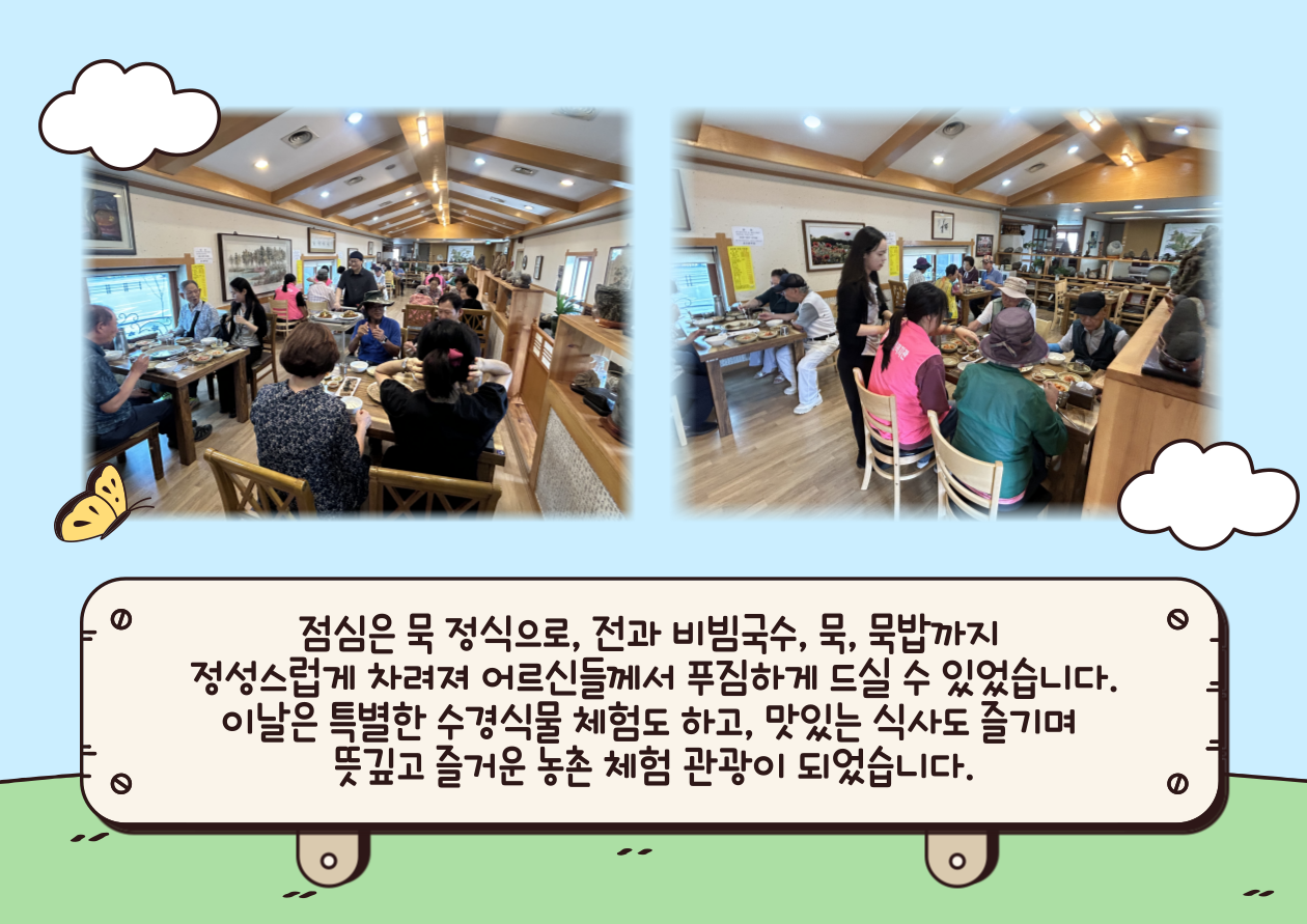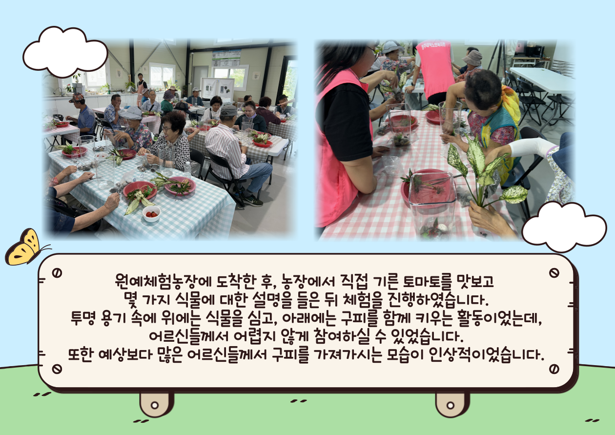지난번 장 담그기 체험에 이어, 두 번째 농촌체험관광으로 원예 수경식물 체험을 진행하였습니다. 어르신들께서 “요즘 집에만 있어서 나들이 같은 프로그램이 없나요?” 하고 말씀해 주신 적이 있었는데, 이번 활동을 통해 비록 본격적인 나들이는 아니더라도 평소 접하기 어려운 농촌체험을 하고, 함께 식사도 나누며 특별한 시간을 보내실 수 있었습니다.