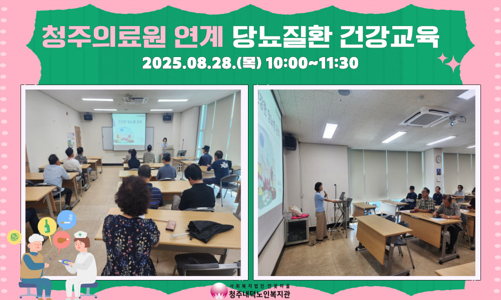 2025년 8월 28일 목요일, 오전10시부터 청주내덕노인복지관 2층 배움방에서 청주의료원과 함께 당뇨질환 건강교육을 진행하였습니다. 충청북도청주의료원 공공보건의료협력팀과 연계하여 진행된 당뇨질환 건강교육은 당뇨의 발생원인부터 관리방법, 치료방법 등 다양한 정보를 알아볼 수 있었습니다.