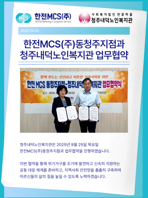 9월 25일(목) 오전 9시, 청주내덕노인복지관에서 지역사회 취약계층 발굴 및 지원 강화를 위한 업무협약을 체결했습니다. 이번 협약은 복지관과 한전MCS(주) 동청주지점이 함께 지역 연계 기반을 넓히고 복지안전망을 공고히 하고자 마련된 뜻깊은 자리였습니다.