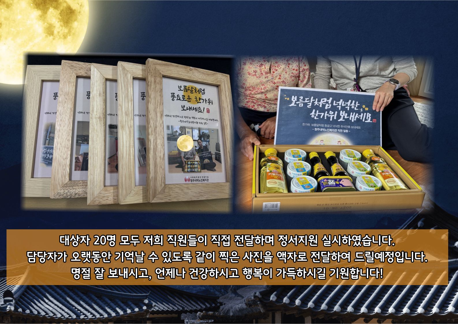 2025년 추석을 맞이하여 정서지원 대상자 20명 가정에 방문하여 선정하여 어르신 건강을 위한 후원물품(상황버섯 진액골드)과 추석선물세트를 지원하였습니다. 9월 22일부터 23일까지는 직원들이 직접 가정에 방문하여 따뜻한 안부 인사와 함께 선물을 전달하며 정서지원을 진행하였습니다. 한 어르신께서는 “어버이날이나 명절이 다가오면 특히 자식들 생각에 마음이 아프고, 몸도 더 힘들어지는데 이렇게 사회복지사가 매번 찾아와 챙겨주니 정말 고맙고 큰 의지가 된다.” 라고 말씀해주셨습니다. 그 말씀이 저희에게도 큰 울림이 되었고, 어르신들께 조금이나마 마음의 위로와 힘이 될 수 있기를 바라는 마음이 더욱 커졌습니다. 다가오는 추석 명절 연휴만큼은 근심과 걱정을 잠시 내려두시고, 따뜻한 마음과 풍성한 나눔 속에서 행복한 시간을 보내시기를 진심으로 기원합니다.