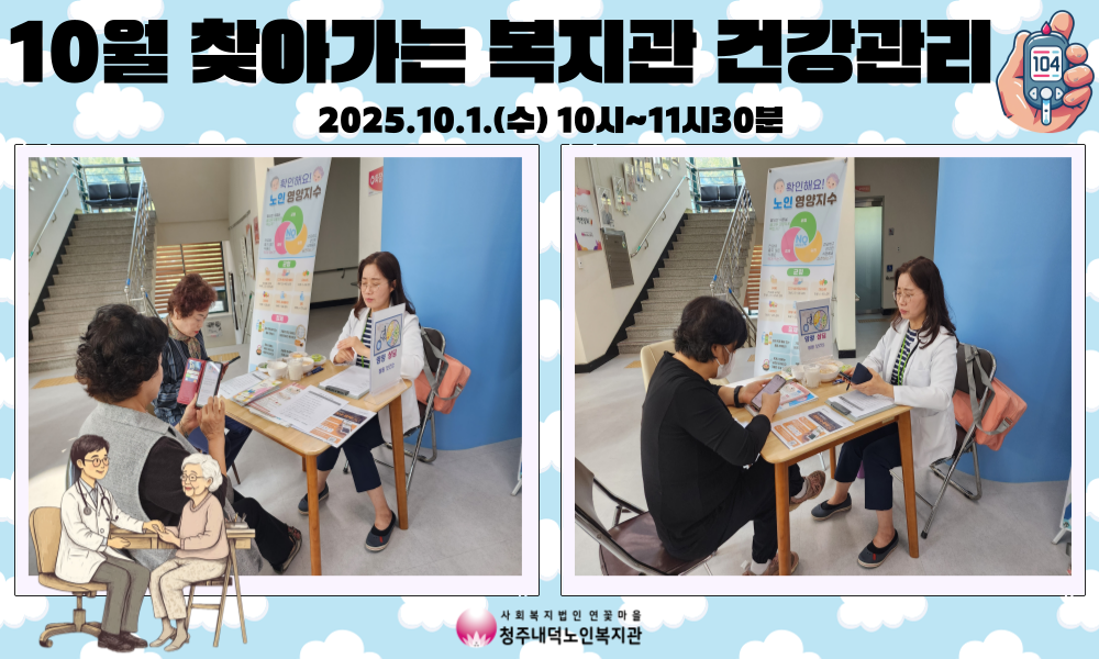 청주내덕노인복지관에서는 10월1일(수) 10시부터 복지관 1층 로비에서 청원보건소와 함께하는 건강생활지원사업인 찾아가는 복지관 건강관리가 진행되었습니다. 10월 찾아가는 복지관 건강관리는 혈압 및 혈당 검사와 영양 상담이 진행되었습니다. 이번 10월 찾아가는 복지관 건강관리도 많은 참여자들이 관심을 가지고 참여해주었습니다. 찾아가는 복지관 건강관리는 11월을 마지막으로 2025년 활동이 마무리되오니 11월 5일(수) 10시, 많은 관심과 참여 바랍니다. |