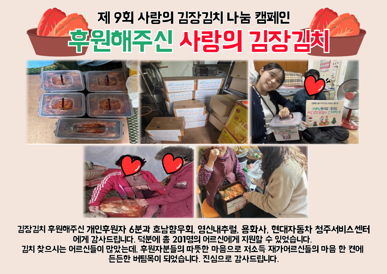 제 9회 사랑의 김장김치 나눔 캠페인을 통해 후원자분들의 따뜻한 마음이 담긴 김장김치를 지역 어르신들께 전달하였습니다. 이번 캠페인은 개인 후원자분들과 호남향우회, 영신내추럴, 용화사, 현대자동차 청주서비스센터 에서 김장김치를 후원해주셨으며, 그 덕분에 총 201명의 어르신에게 지원할 수 있었습니다.