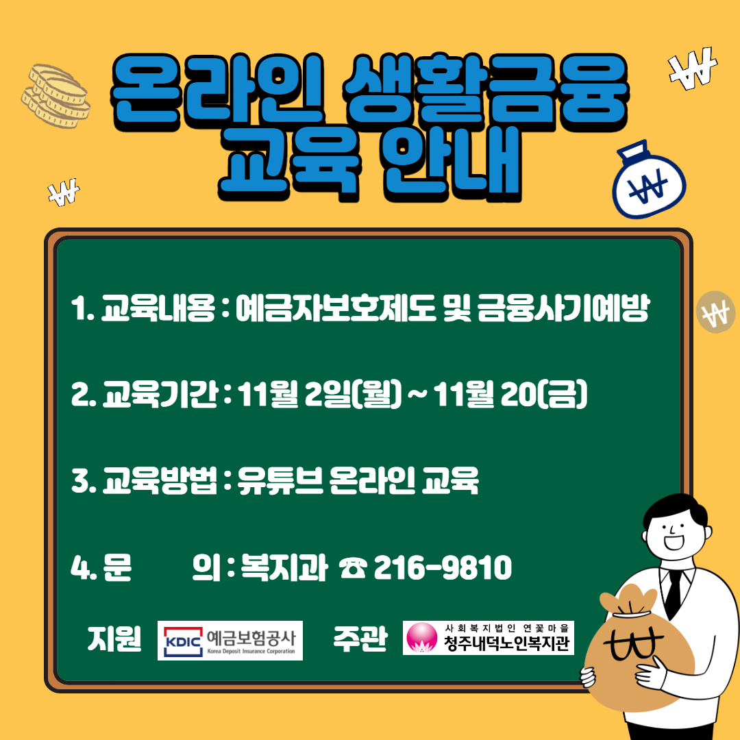 생활금융교육과 관련하여 11월2일(월) ~ 11월 20일(금) 3주간 예금자보호제도 및 금융사기예방 교육을 실시합니다.