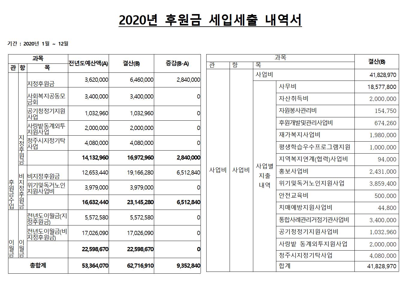 청주내덕노인복지관에서는 사회복지법인 및 사회복지시설 재무회계규칙 제41조의 6에 의거 2020년도 후원금(품) 수입 및 사용 결과를 공고합니다.