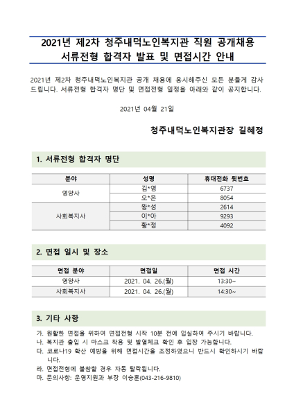 | 2021년 제2차 직원 공개채용 서류전형 합격자 및 면접시간 안내 | |||