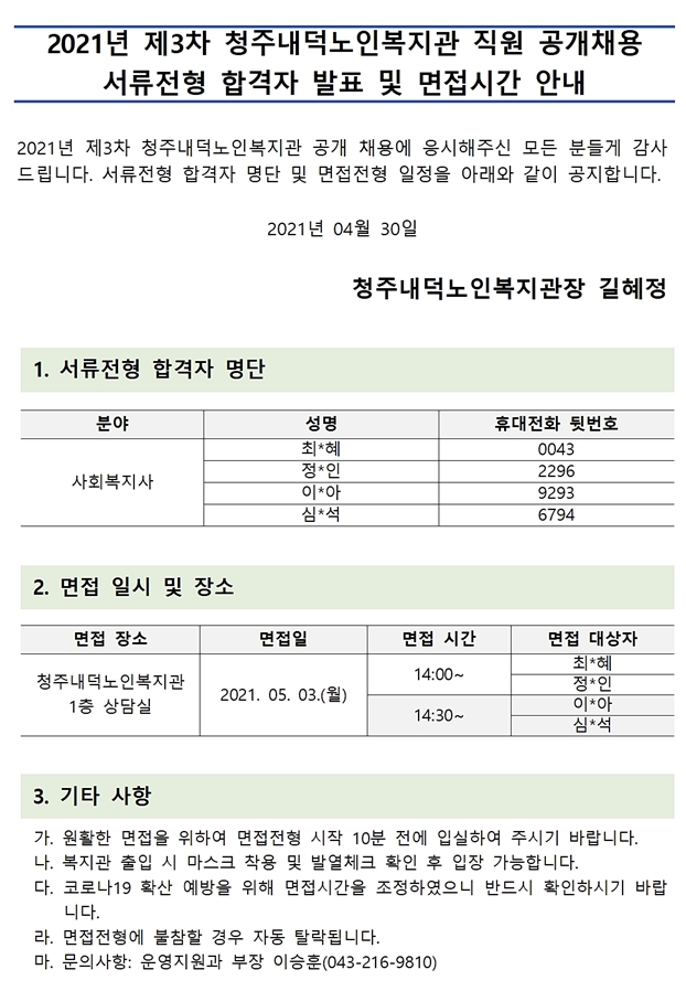 | 2021년 제3차 직원 공개채용 서류전형 합격자 및 면접시간 안내 | |||