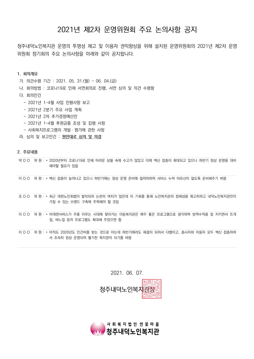 | 2021년 제2차(2분기) 운영위원회의 주요사항 공지 | |||