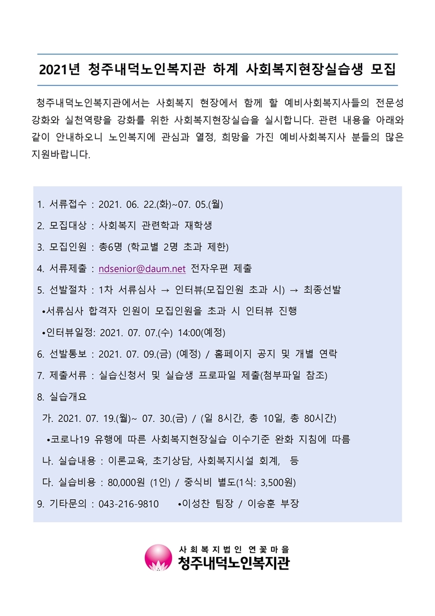 | 2021년 하계 사회복지현장실습생 모집 공고 | |||
