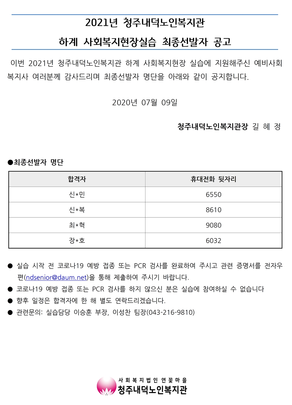 | 2021년 하계 사회복지현장실습 최종선발자 공고 | |||