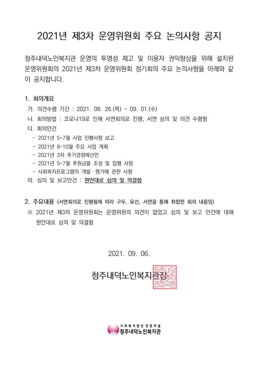 | 2021년 제3차(3분기) 운영위원회의 주요사항 공지 | |||