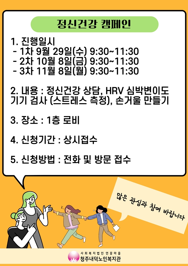 캠페인을 통한 정신건강 인식개선 및 이동상담 등의 서비스 제공을 위해 정신건강 캠페인을 실시합니다 9~11월까지 월 1회 진행하여 정신건강 상담, HRV 심박변이도 기기 검사(스트레스 측정), 손거울 만들기 등으로 진행됩니다. 본 캠페인은 청원정신건강복지센터에서 지원하여 운영합니다. 10월 29일까지 상시 접수를 받고 있으니 많은 관심과 참여 바랍니다