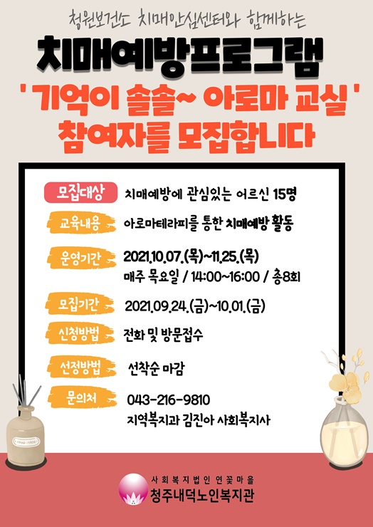 모집종료되었습니다 청원보건소 치매안심센터와 함께하는 치매예방교실 기억이 솔솔~ 아로마 교실 참여자를 모집합니다.