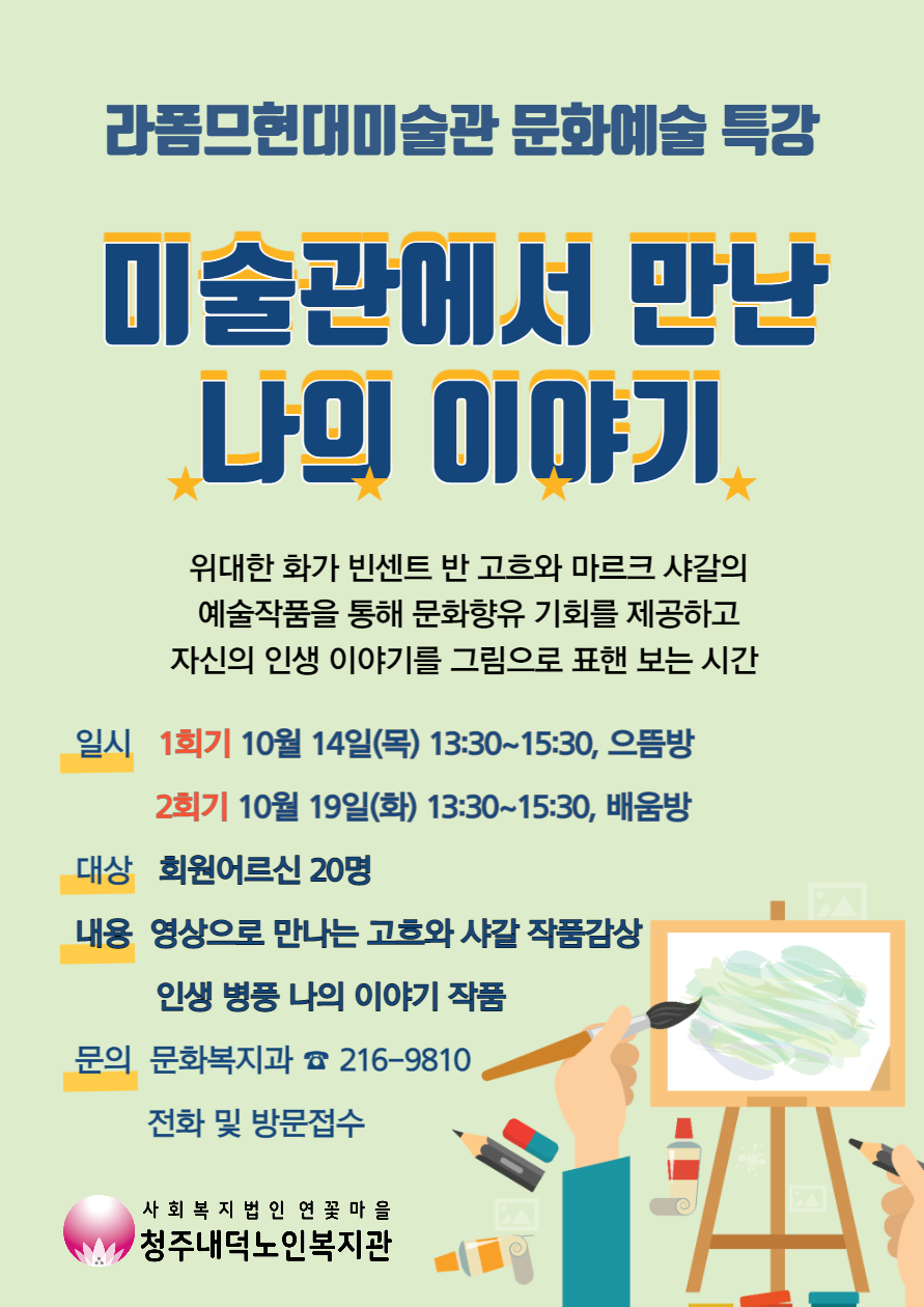 [청주내덕노인복지관 무료특강 안내] 라폼므현대미술관과 연계하여 미술관에서 만난 나의 이야기라는 주제로 문화예술 특강을 진행합니다. 회원여러분의 많은 관심과 참여바랍니다. -일시: 10월 14일(목), 10월 19일(화) / 매회 오후 1시 30분~3시 30분 -장소: 2층 강의실(별도 안내 예정) -내용: 워크북을 활용한 유명화가 고흐와 샤갈 작품 감상 및 체험, 그림으로 만나는 자신의 인생이야기 -인원: 20명 -신청방법: 10월 11일까지 복지관 전화접수(신청인원 초과시 추첨선발) -정원을 초과하여 모집 마감합니다.